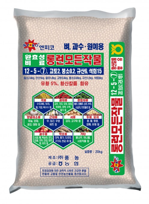 엔피코 롱런모든작물 비료는 삼요소와 고토, 붕소 및 규산, 석회, 유황이 함유되어 벼, 과수, 원예 등 모든 자굼ㄹ에 사용 가능한 완효성비료입니다.